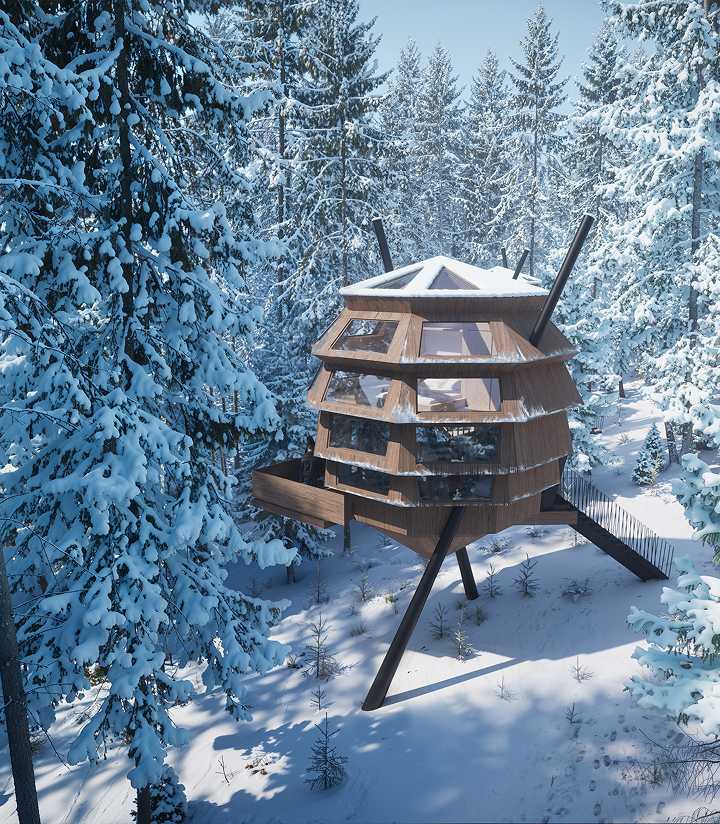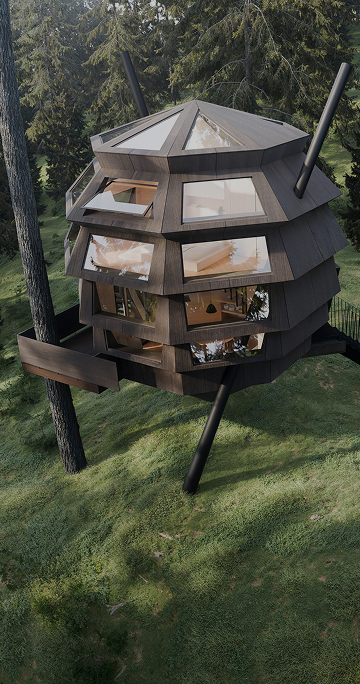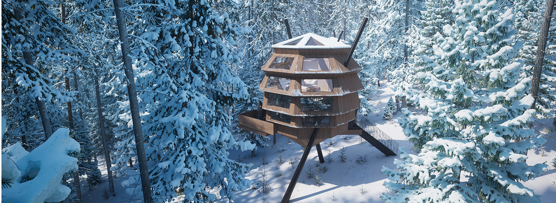Afin d’obtenir les autorisations, l’accent a donc été mis sur la réduction maximale de l’impact écologique. Une réflexion pour le tracé des canalisations afin de préserver les racines mères des arbres, l’implantation au sol des structures avec trois points statiques minimes, une colonne d’escalier qui dissimule tous les écoulements et le chauffage par géothermie font partie de la stratégie. « Les structures sont en bois suisse, l’isolation est en ouate de cellulose biosourcée et leur transport vers le site se fera par héliportage pour ne pas abîmer les sols. » Pour l’eau et l’électricité, le site profitera de la proximité du réservoir du Mont- Noble et de l’Espace Loisirs du même nom. Ce dernier permettra de compléter l’expérience immersive de cette nouvelle offre hôtelière.