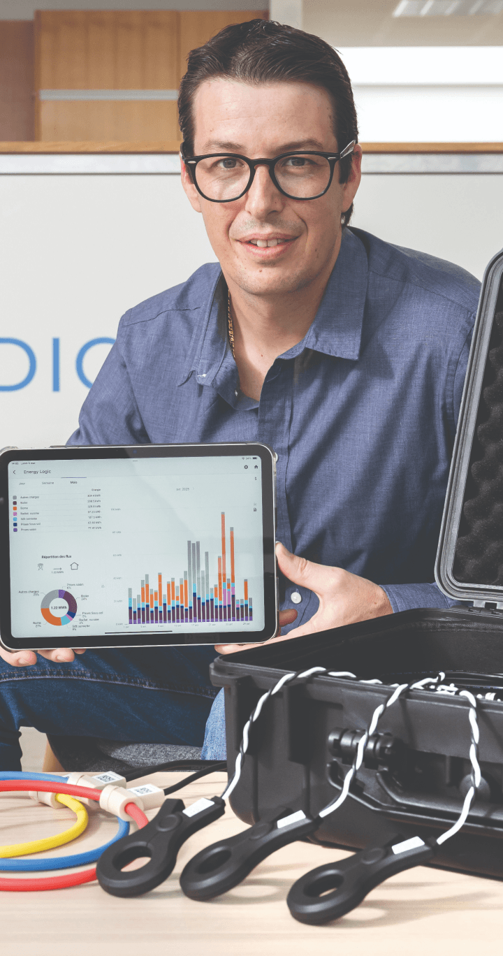 La valeur ajoutée de Logic Meter réside aussi dans l’exploitation intelligente des données, grâce à des fonctions avancées de filtrage, d’analyse et d’interprétation. Les résultats en temps réel et l’historique des consommations peuvent être consultés sur le portail dédié, ce qui est très utile dans les démarches d’efficacité énergétique, longtemps basées sur de simples estimations. OIKEN a ainsi fait l’acquisition de plusieurs valises, en lien avec le service Data+ proposé à sa clientèle entreprises dans le cadre des audits énergétiques (lire l’encadré). Logic Meter est aujourd’hui déployé principalement en Suisse romande et Digital Logic vise l’objectif d’une centaine d’unités vendues cette année. Soutenue par la Fondation The Ark, cette innovation valaisanne s’adresse en priorité aux distributeurs d’énergie, aux auditeurs énergétiques, aux électriciens spécialisés ainsi qu’aux installateurs solaires.